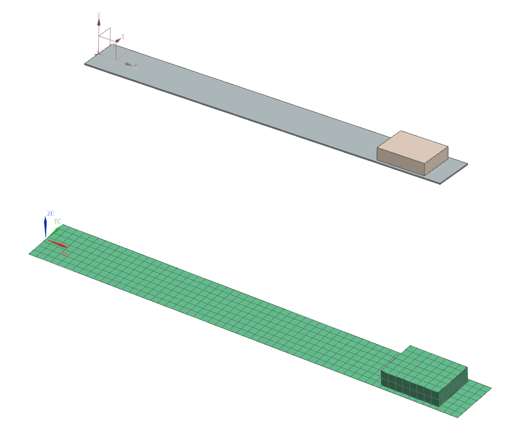 在多数跌落分析中,地面是刚性的或者刚度很大(几乎不考虑其变形),但重物跌落在柔性的悬臂梁上时,其施加的瞬态初始条件发生了很大的变化,比如其速度方向跟随悬臂梁挠度变化的,那么如何合理去模拟这类跌落过程呢?