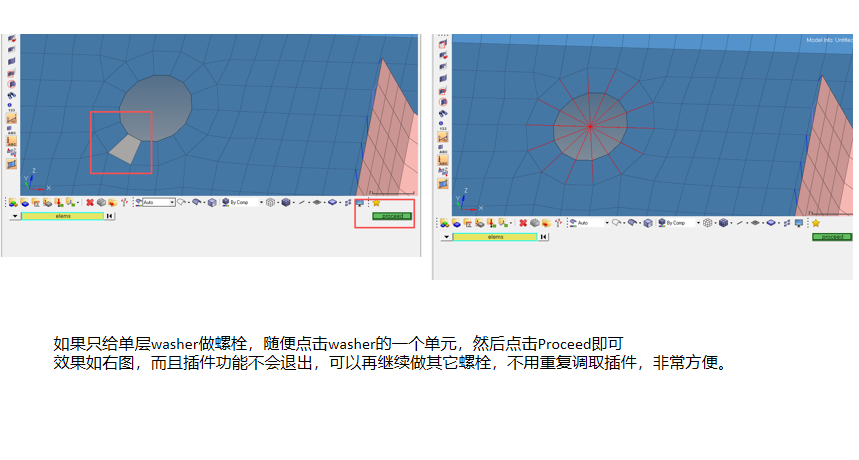 调取插件,选择一个孔边的单元,点击Proceed,直接打好螺栓。