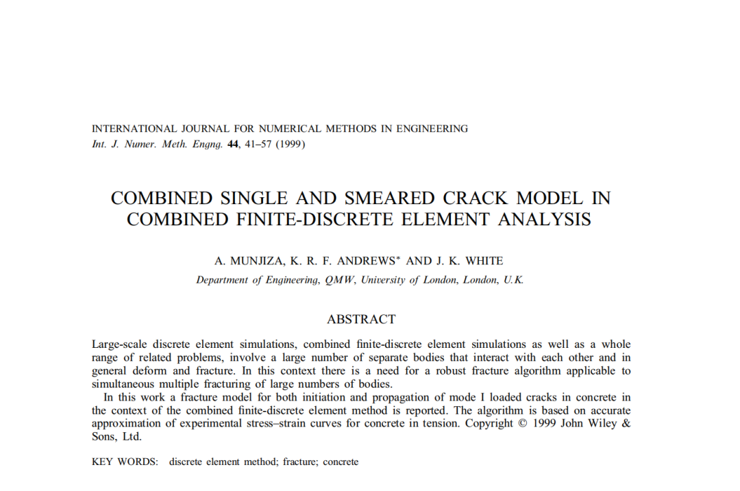 大规模离散单元模拟,结合离散单元模拟以及一系列相关问题,涉及大量相互作用的分离体,一般为变形和断裂。在这种情况下,需要一种适用于大量物体同时进行多次压裂的稳健的压裂算法。本文报道了混凝土 I 型加载裂纹起裂和扩展的断裂模型。该算法是基于混凝土受拉试验应力-应变曲线的精确逼近。