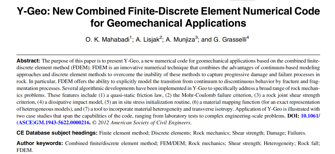 提出了一种基于组合有限离散元法(FDEM)的地质力学应用数值程序 Y-Geo。FDEM 是一种创新的数值技术,它结合了基于连续介质的建模方法和离散元方法的优点,克服了这些方法无法捕捉岩石的渐进损伤和破坏过程。特别是,FDEM 提供了通过断裂和破碎过程明确模拟从连续到不连续行为的能力。在 Y-Geo 中已经实现了一些算法开发,以专门解决广泛的岩石力学问题。这些特点包括(1)准静态摩擦定律,(2) Mohr-Coulomb 破坏准则,(3)岩石节理剪切强度准则,(4)耗散冲击模型,(5)原位应力初始化程序,(6)材料映射函数(用于精确表示非均质模型) ,和(7)一个工具,以纳入材料非均质性和横向各向同性。Y-Geo 的应用通过两个案例研究来说明,这两个案例研究跨越了代码的能力,从实验室测试到复杂的工程规模问题