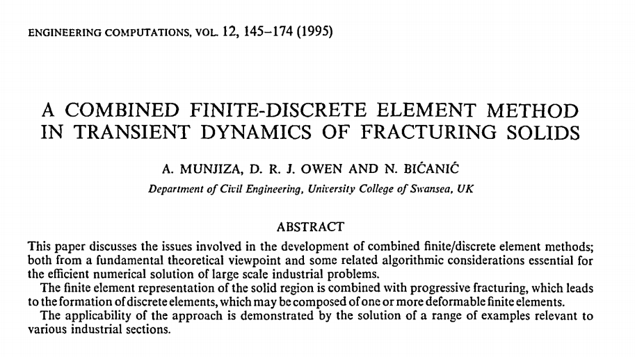 在20世纪的最后十年里,离散元方法与有限元方法相结合。这种新方法被称为“组合有限离散元法”。由于相对便宜的高性能硬件迅速变得可用,可以考虑包括数百万粒子,最近甚至数十亿粒子的组合有限离散元系统。这些,再加上最近的算法发展,使得组合有限元-离散元方法被应用于各种工程和科学问题,从粉末技术、陶瓷、复合材料、岩石爆破、采矿、拆除、爆炸和国防冲击,到地质和环境应用。