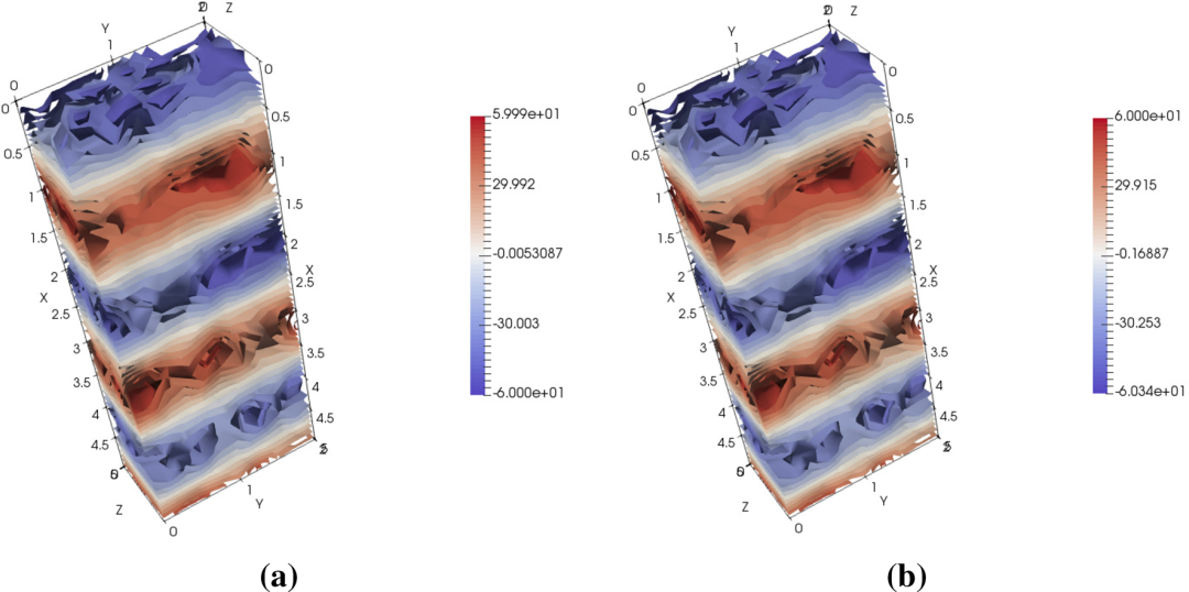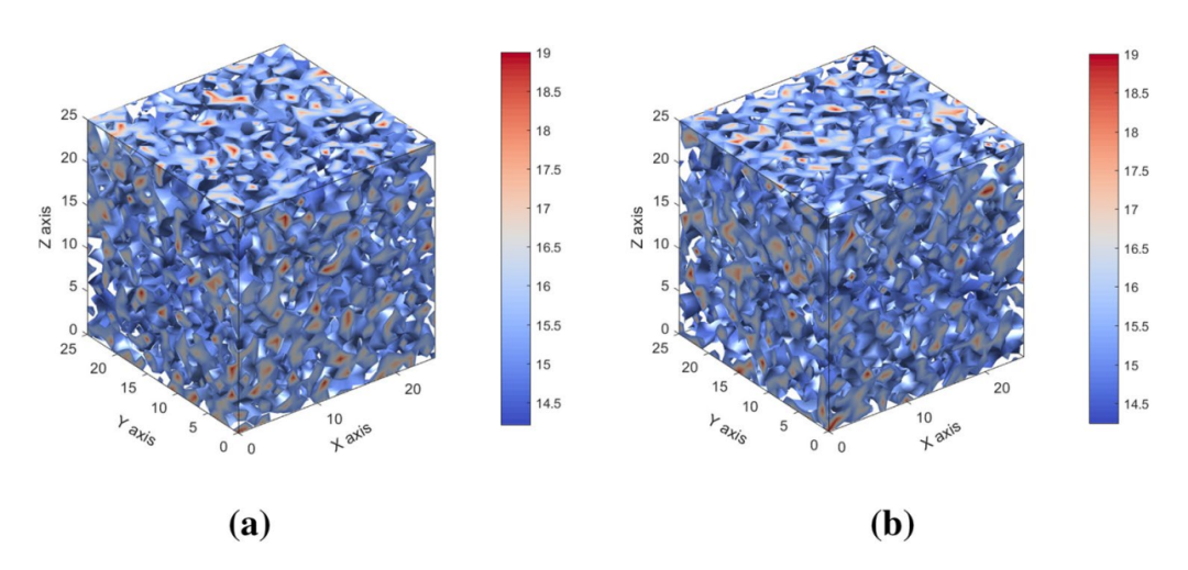 图:(a)指数相关和 (b) 高斯相关的三维导水率