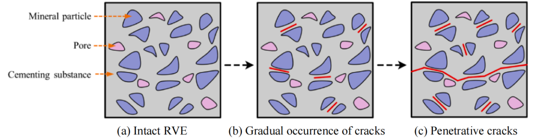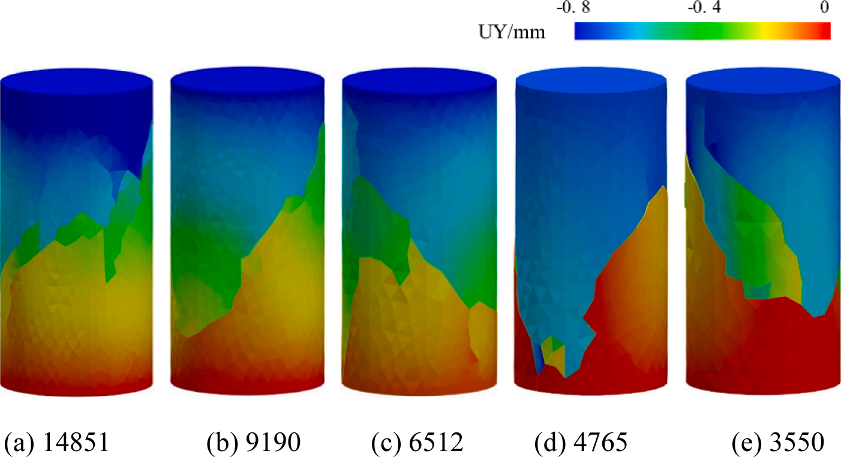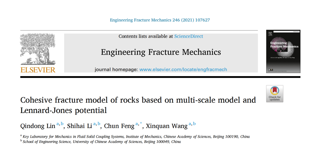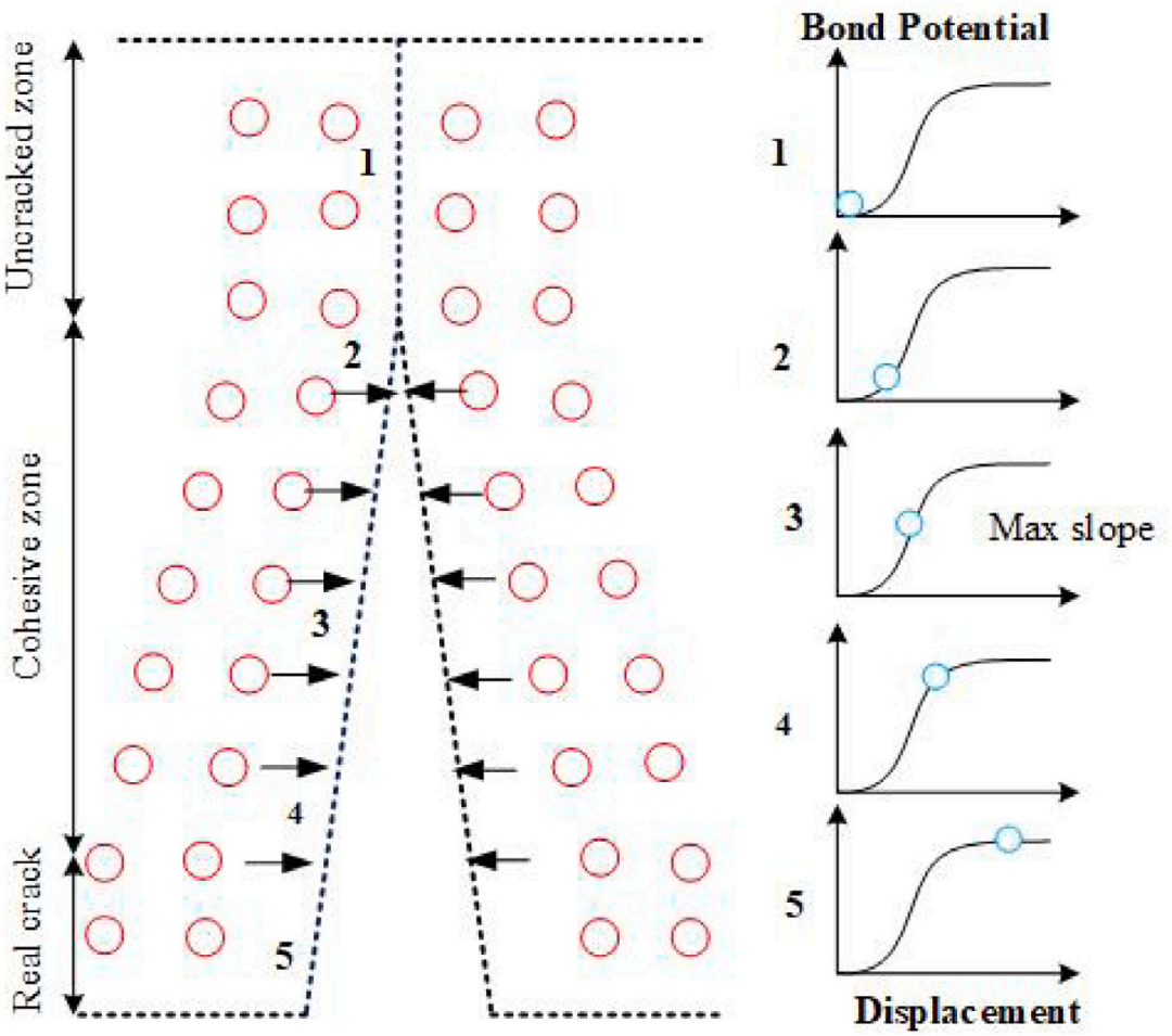 为了模拟裂纹萌生和扩展过程中的能量耗散现象,本研究基于岩石的多尺度模型和非键合分子之间的Lennard-Jones势,提出了一种新的内聚断裂模型。该模型建立了岩石多尺度模型中变形的对应关系,表明断裂能本质上是变形能转化为分子间势能的表现。首先,根据岩石的结构特征和断裂特征,建立了岩石的多尺度模型,分析了不同尺度下岩石变形的对应关系。然后,建立了与拉伸和剪切过程相对应的内聚断裂模型的力和势能方程。最后,通过三个数值模拟验证了粘性断裂模型的准确性。结果表明,内聚断裂模型能够准确地拟合I型和II型试验的理论值和实验结果。在单轴压缩试验中,粘性断裂模型可以准确地模拟岩石的单轴抗压强度和断裂模式。