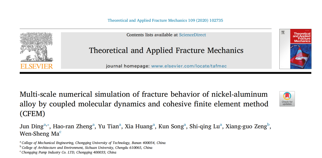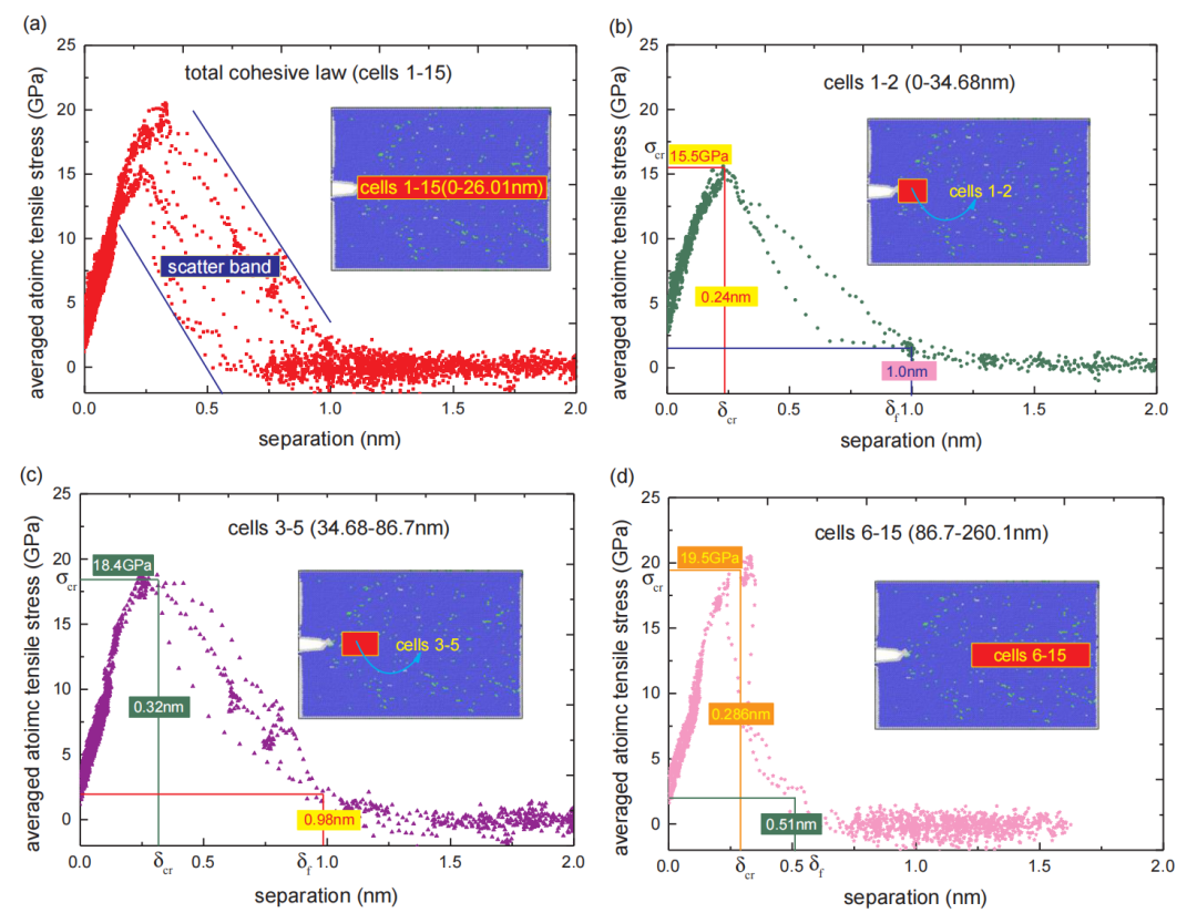 在本研究中,利用耦合分子动力学(MD)和内聚有限元方法(CFEM)对B2 NiAl合金的裂纹扩展进行了多尺度研究。特别是,通过使用python编程,建立了一个用于批量插入的具有零厚度内聚单元的有限元模型。采用MD模拟得到的T-S曲线作为零厚度内聚单元的材料输入参数,研究了微裂纹的扩展机理,实现了宏观裂纹的随机扩展模拟。结果表明,在微观尺度上,B2-NiAl单晶的裂纹扩展行为主要是由裂纹前沿应力集中产生的主裂纹和微孔的连续聚结引起的。此外,单晶B2-NiAl经历了相变并遵循贝恩路径。此外,将不同温度下的T-S曲线与Needleman经典理论模型进行了比较,证明了Needlemman模型的正确性。然后,计算了B2-NiAl合金在不同温度下的宏观断裂韧性值,并与实验结果进行了比较。这种比较证明了彼此之间的良好一致性,并表明通过MD获得的T-S曲线可以应用于有限元方法。这些结果验证了这种多尺度方法的真实性,为宏观和微观尺度的裂缝行为模拟提供了一种替代方法。