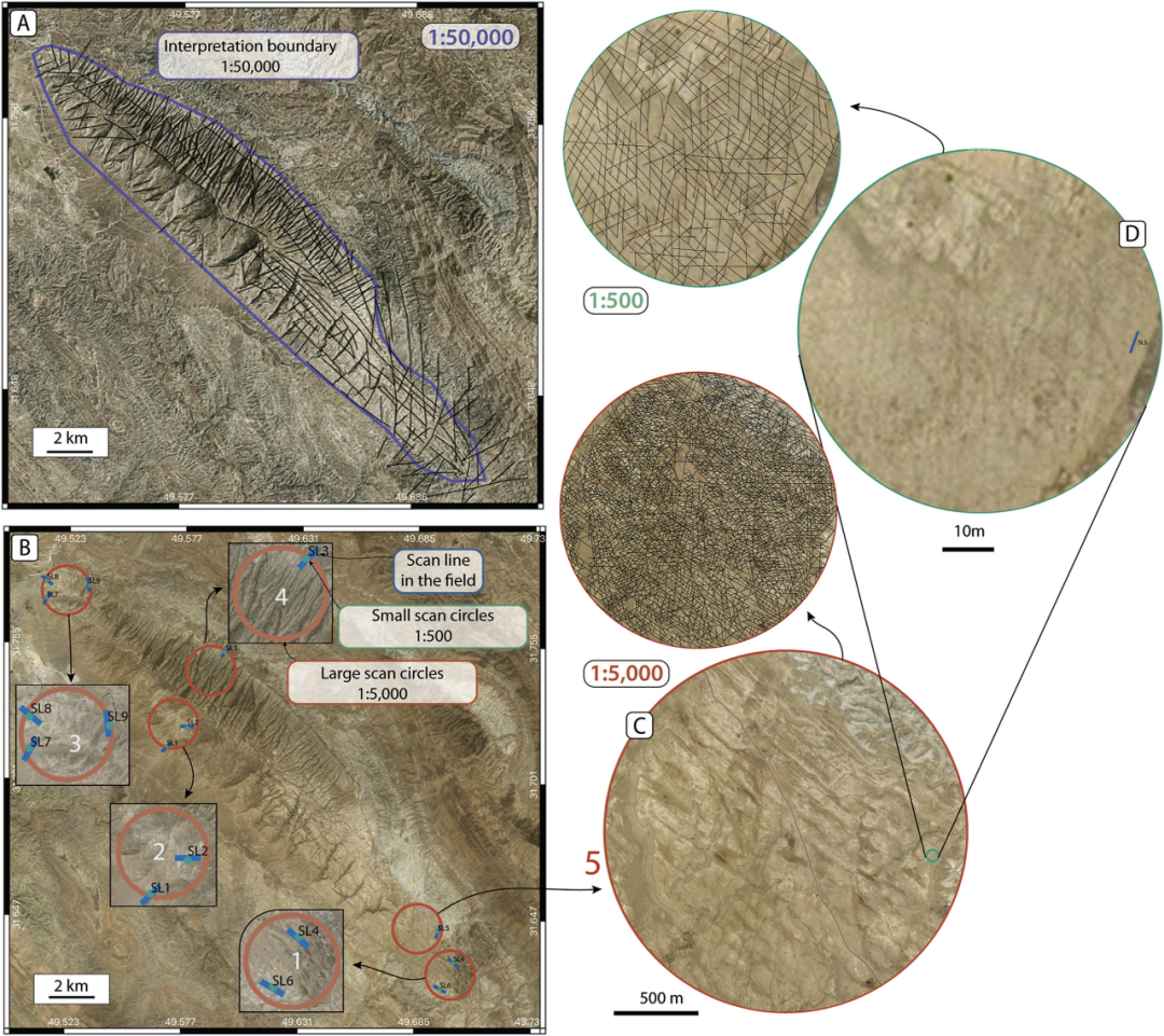 图:骨折数据集的收集。(A) :根据1:50000比例的卫星图像解释的断裂网络。(B–D):红色和绿色圆圈:分别在1:5000(C)和1:500(D)比例的航空图像上解释的裂缝网络的解释边界。蓝线:现场扫描线的大致位置和方向。