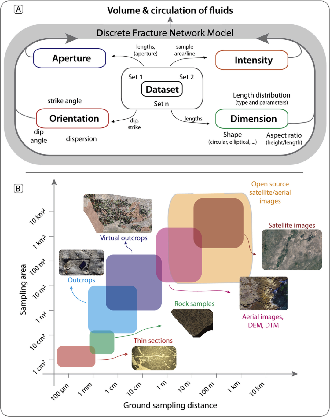 图:介绍(A) 通过构建随机离散裂缝网络模型来模拟流体流动所需的工作流程和输入参数。数据集中的裂缝根据裂缝的方向和/或类型被分类为不同的集 合。长度、倾角和走向角以及采样尺寸用于从方向、尺寸、强度和孔径的角度对每组进行统计描述。(B) 用于裂缝网络分析的最常见方法的地面采样距离和采样面积的示意图。