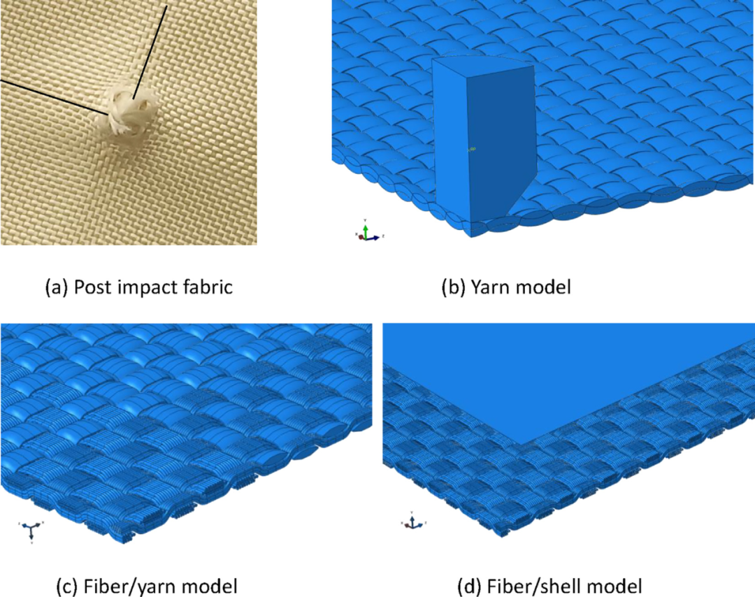 图:Twaron 织物的有限元模型(a)后冲击织物,(b)纱线模型(c) ,纤维/纱线模型,(d)纤维/壳体模型
