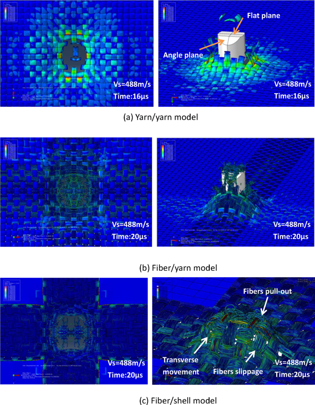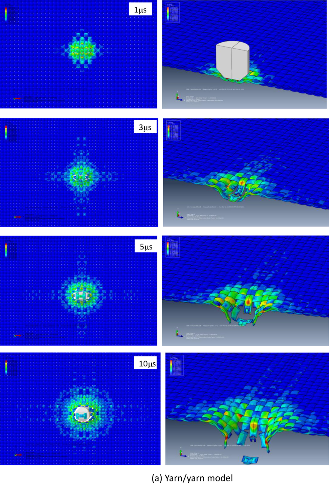 为了捕捉机织物在冲击载荷作用下纤维和纱线的全部细节,首先提出了一种多尺度建模技术来模拟包含纤维束和纱线的机织物。对机织物进行了纱线水平中尺度和包含纤维束的多尺度建模。对于两个多尺度模型,在织物的局部区域,用具有一定卷曲波动的固体元素的纤维束对原纱进行计算表示。在全球范围内,这些纤维束与具有固体成分的次级纱交织或与具有壳体成分的织物板结合。通过弹道试验结果对这三种模型进行了验证。与纱线层面的连续体模型相比,局部区域的纤维束模型表现出更准确的弹道反应和更详细的织物在弹道冲击下的破坏机理。目前的纤维束/纱线模型将有力地研究织物结构对弹道性能的影响,这需要更详细的纱线和纤维的弹道响应。