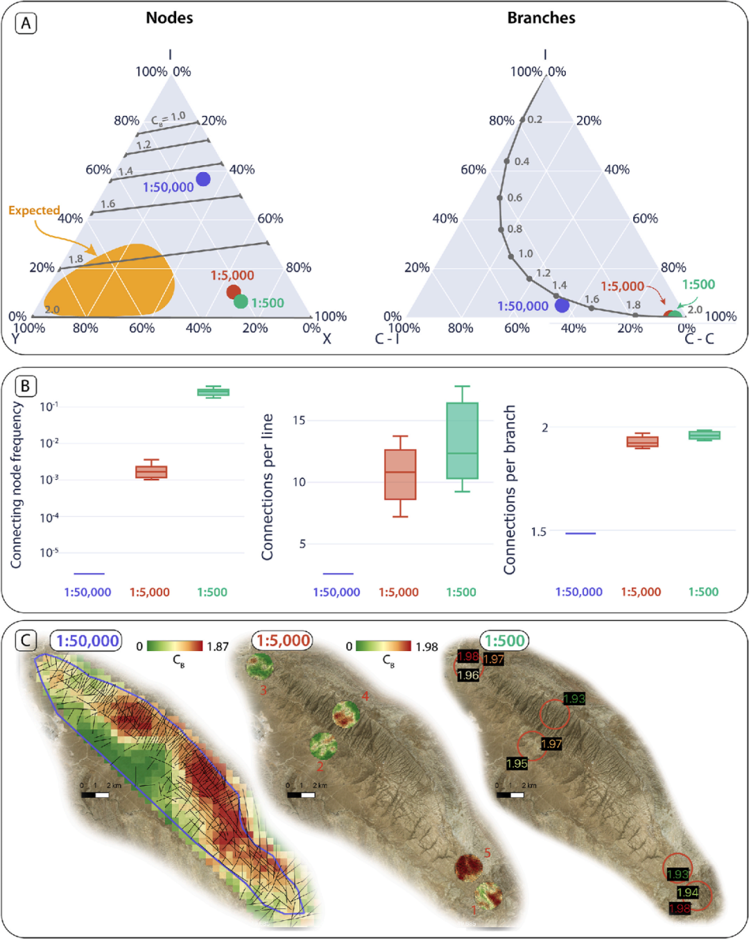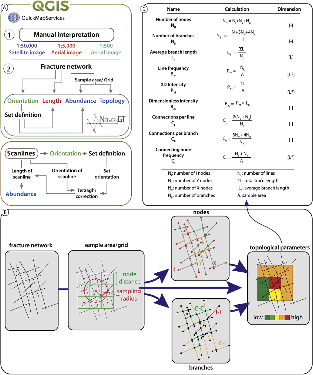 图:(A) :使用遥感(绿色方框)和现场扫描线(棕色方框)表征裂缝网络所采用的示意性工作流程。(B) :使用NetworkGT计算拓扑参数的工作流。使用采样区域或采样网格对裂缝网络进行采样,以从裂缝网络中提取分支和节点。节点和分支分别分为I、Y和X以及I–I、C–I和C–C(见正文中的解释)。分支、节点和采样区域/网格用作拓扑参数计算的输入。(C) :NetworkGT提供并用于本研究的拓扑参数摘要。