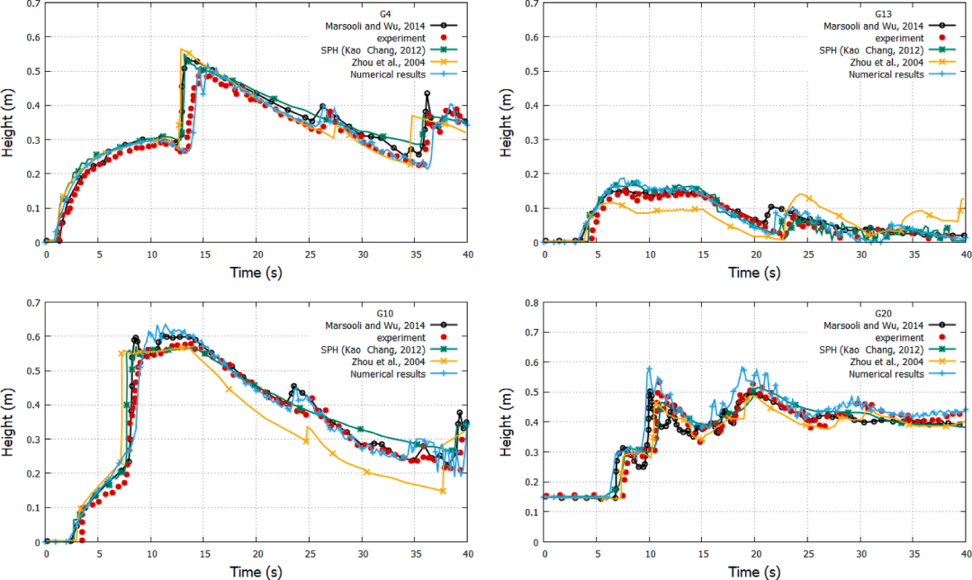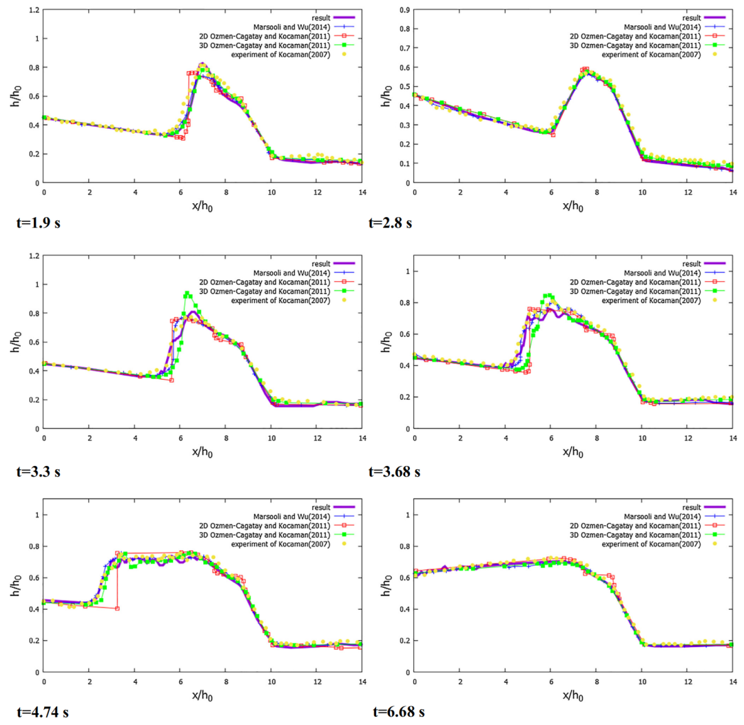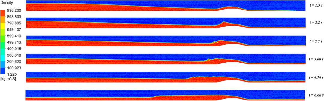 图:不同时间梯形障碍物溃坝过程中水界面的二维变化(t = 1.9 s,t = 2.8 s,t = 3.3 s,t = 3.68 s,t = 4.74 s,t = 6.68 s)。