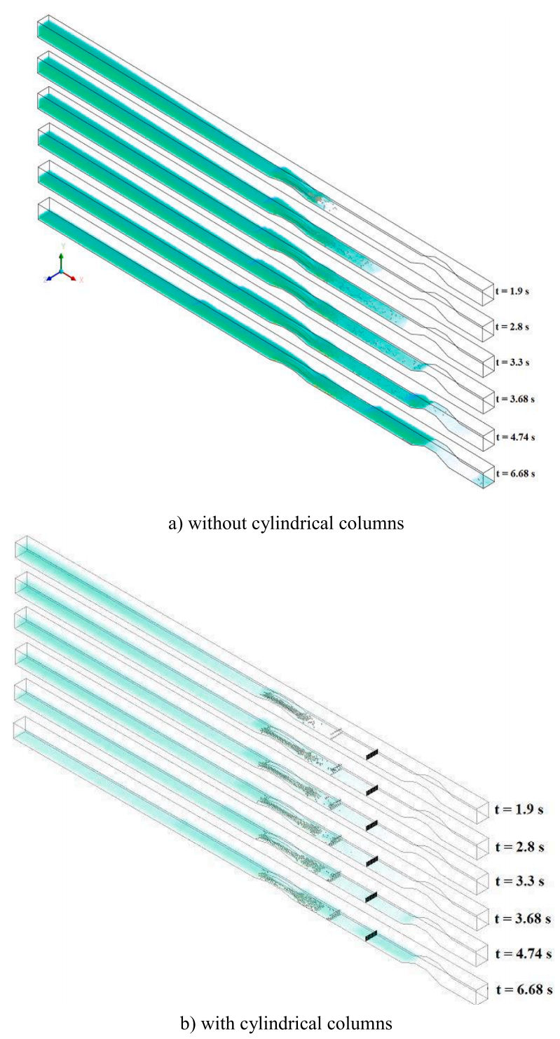 图:在某些时间点,无圆柱和有圆柱的溃坝流传播的三维过程。