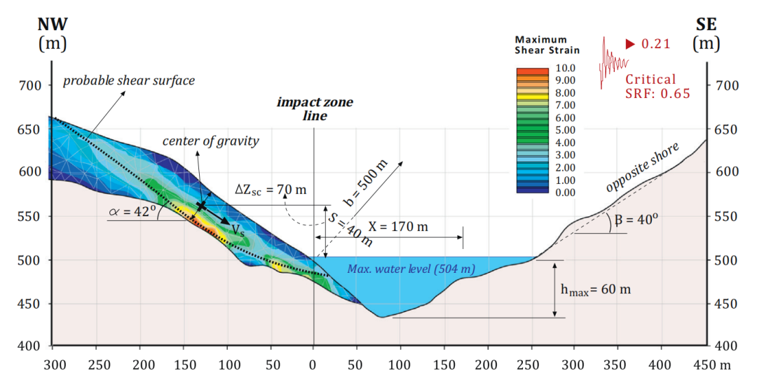 由于土耳其能源需求的迅速增长,大坝和水力发电厂的建设数量显著增加;>在过去的10年里,已经建造了250座大坝。因此,在施工期间和施工后,由于水库附近的山体滑坡,出现了各种工程问题。通常,二维(2D)和三维(3D)经验方程已被用于计算滑坡诱发脉冲波的物理性质和传播;然而,基于三维模拟的方法很少被使用,尽管它们可以使用详细的地形数据更好地模拟大坝水库的复杂几何形状。因此,在本研究中,利用Artvin Dam水库(土耳其东北部)古滑坡的数据,对脉冲波的潜在产生进行了三维数值分析,并将结果与经验方程的计算结果进行了比较。采用基于有限元法的抗剪强度折减分析(FEM-SSR)对边坡稳定性进行了分析。在建立正确的传播模型后,使用具有不同输入参数的方程和基于3D数值分析的模拟来评估冲击波的特性。在使用FLOW-3D软件创建的美国模型中,“漂移通量模型”用于模拟可能的滑坡。雷诺平均Navier-Stokes方程与流体体积(VOF)模型一起用于自由表面建模技术,以模拟波浪的产生。粘性流的重新归一化群模型(RNG)和流体-流体耦合条件的k-ε湍流模型被用作边界条件。结果表明,从所提出的经验方程和三维数值分析中获得的值并不相似。因此,如果储层几何形状非常复杂,波浪传播距离超过几公里(如本研究所示),则应进行高度详细的工程地质研究,以准确定义边界条件,并进行三维数值分析,以构建冲击波模型。