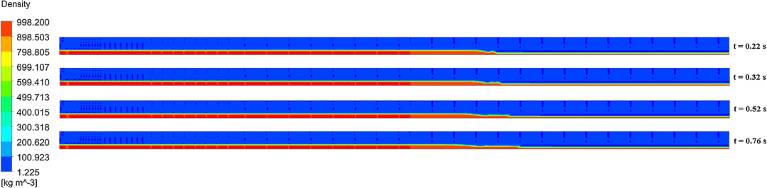 图:溃坝水流过程中不同时间水界面的二维变化(t=0.22s,t=0.32s,t=0.52s,t=0.76s)。
