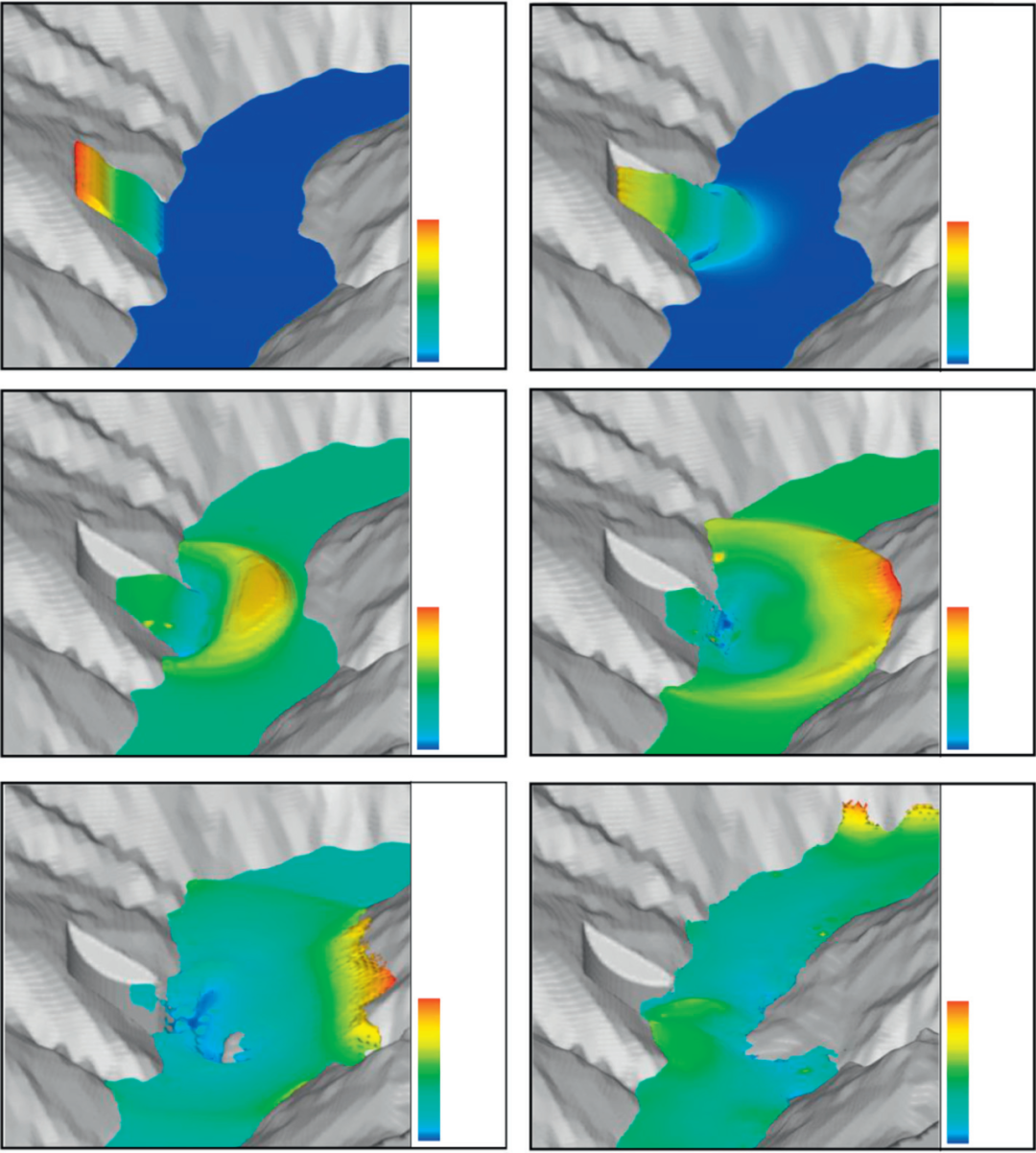 图:通过FLOW-3D(包括添加的原始STL几何形状)对0和35s之间的滑坡诱导的脉冲波形成模型的模拟的示例性结果。