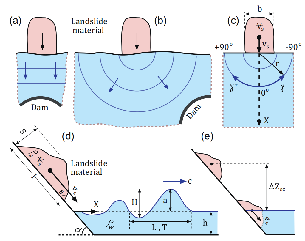 图:直接和完全自由的径向波向坝体的传播(a和b)以及脉冲波的重要控制参数(c、d和e)