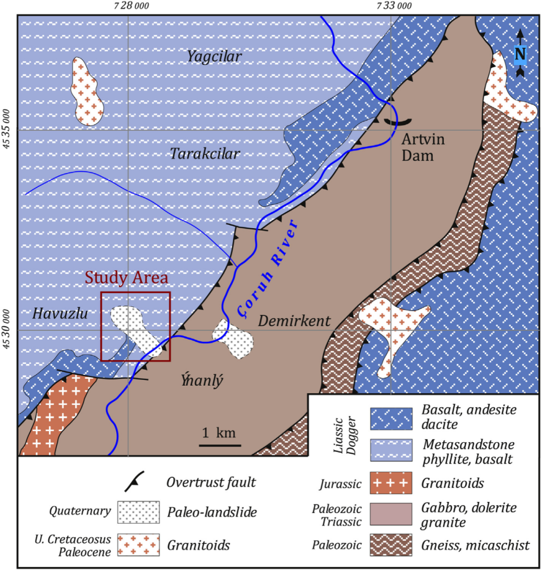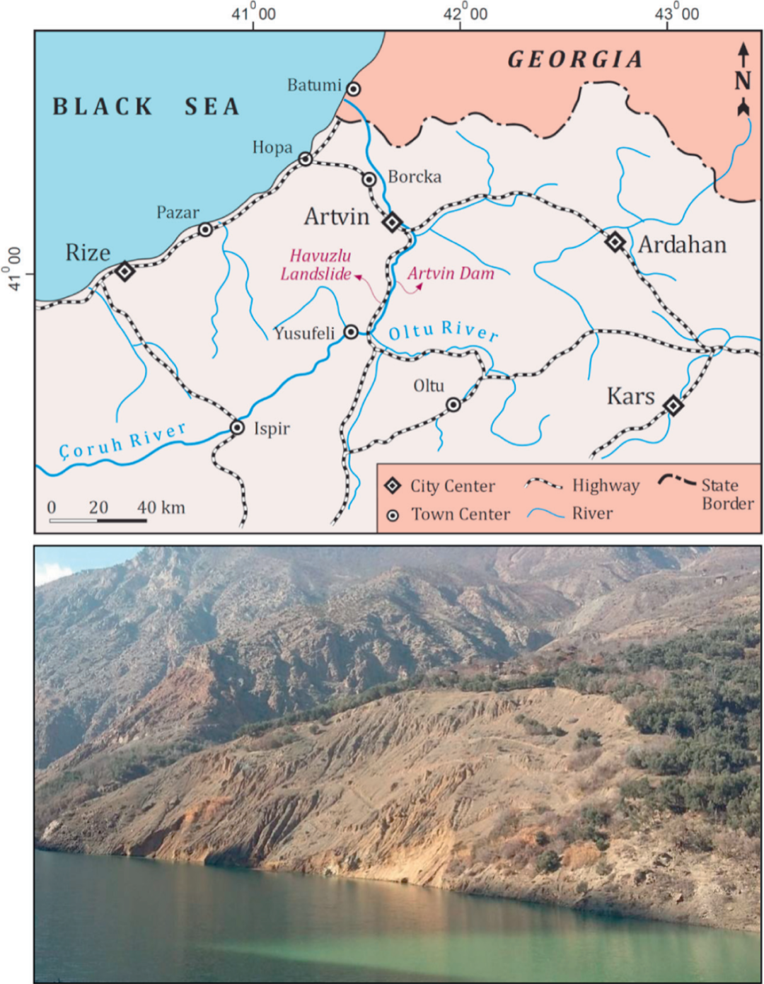 图:(a) 研究区域的位置图,(b)哈武兹鲁古滑坡坡脚的视图。