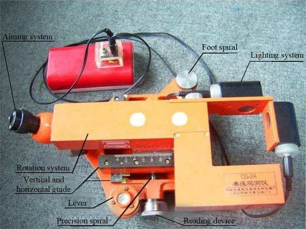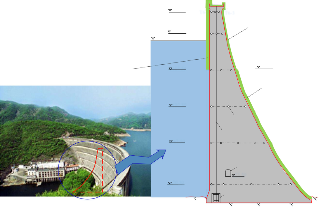 图:混凝土坝中温度计、铅锤和保温层的布置。