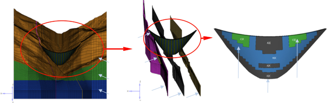 图:有限元模型中控制参数、储层和对岸几何形状的视图。