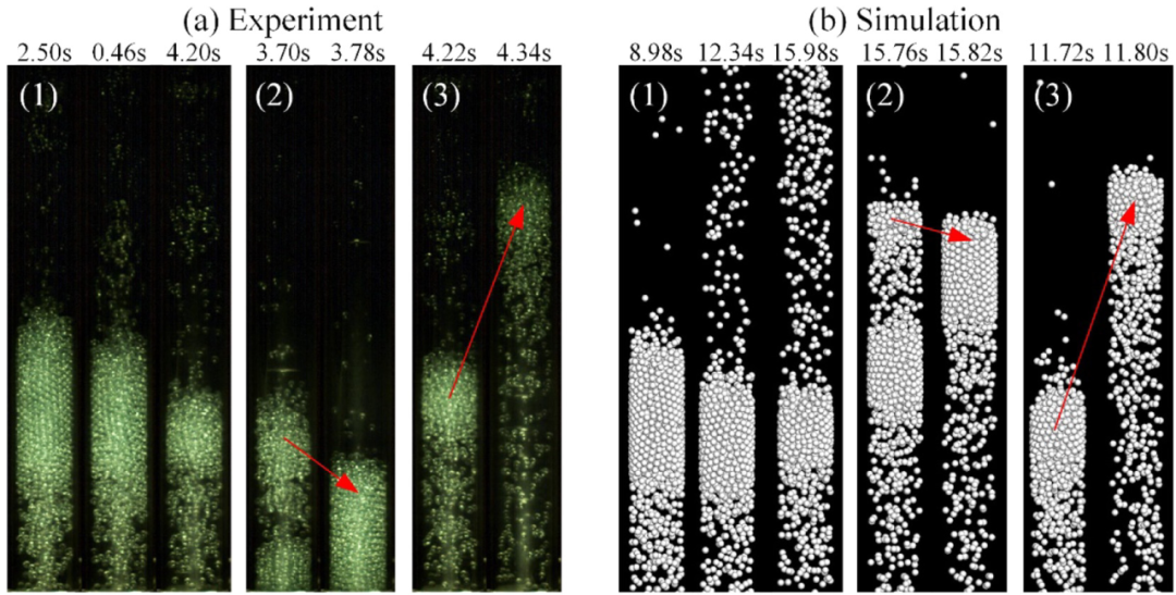 图:Ug = 5.79 m/s 时段塞流流型的实验与模拟比较: (1)随机长度段塞流,(2)向下合并段塞流,(3)段塞坍塌段塞流。