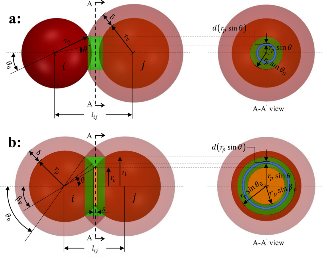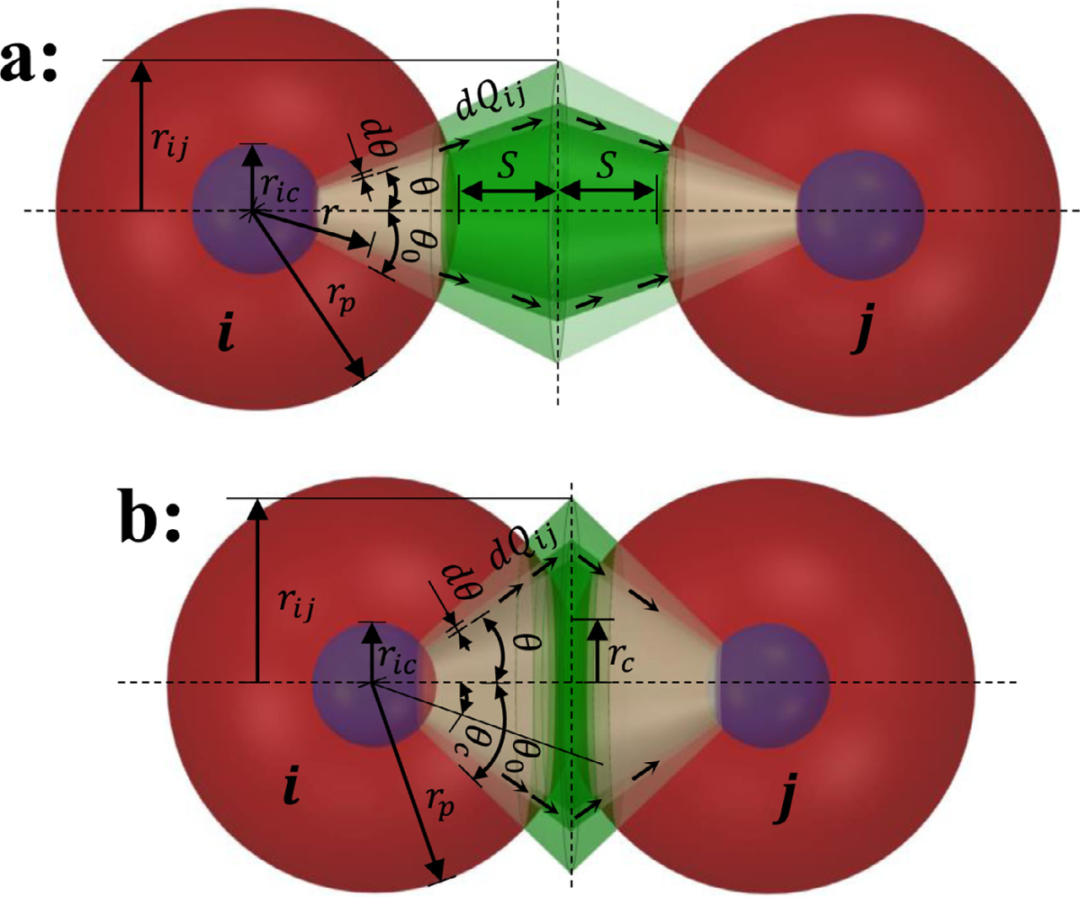 图:计算两颗粒间间接导热的环绕层法示意图。