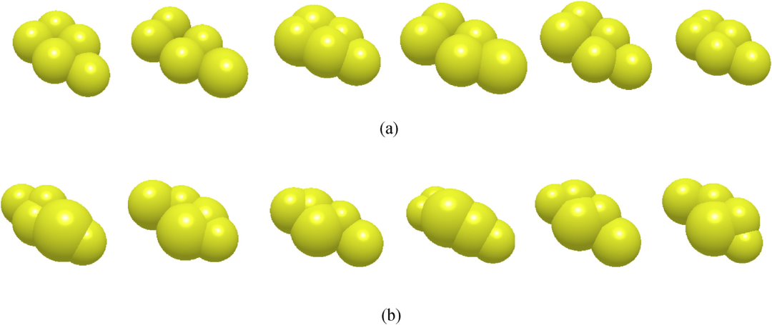 图:DEM模拟中使用的胶合球体团块。(a) 玉米粒和(b)小麦粒。