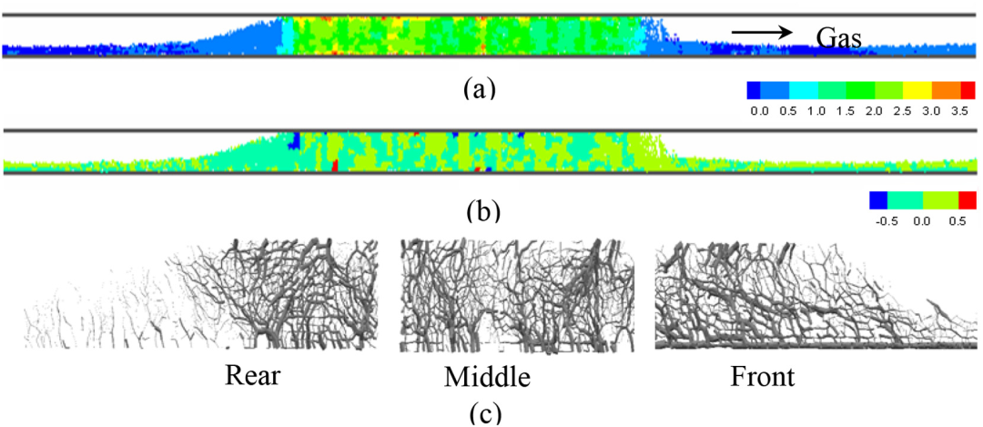 图:显示以下各项空间分布的快照:(a)轴向颗粒流体力;(b) ,径向颗粒流体力;和(c)法向接触力网络