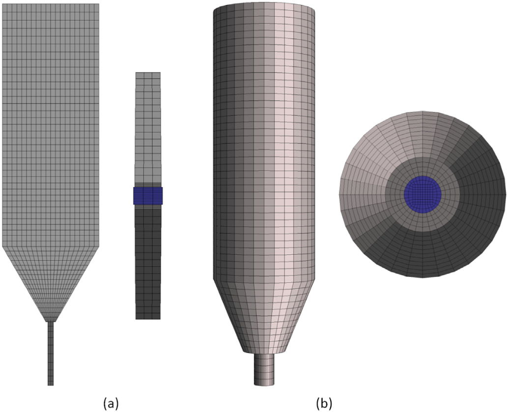 图:拟2D (a)和圆柱形(b)喷动床网格的正面和底面图。