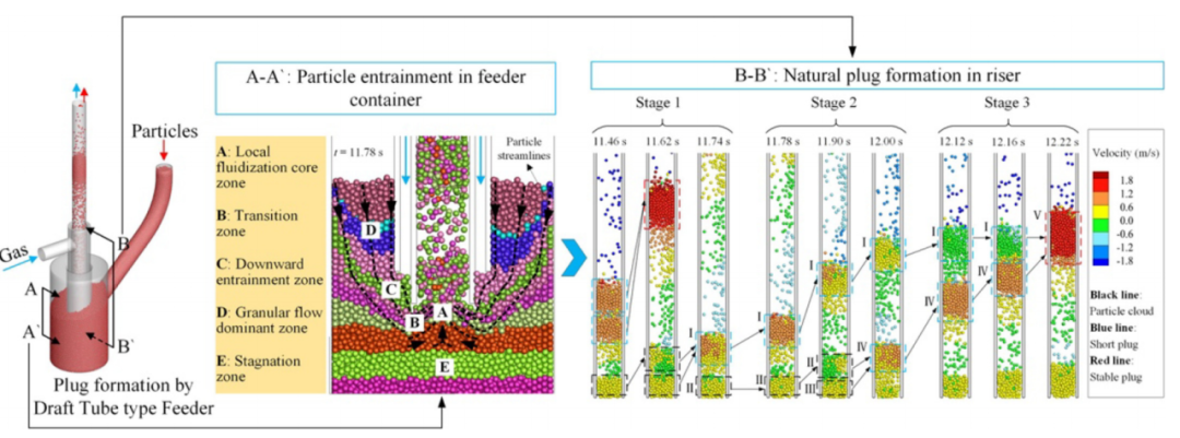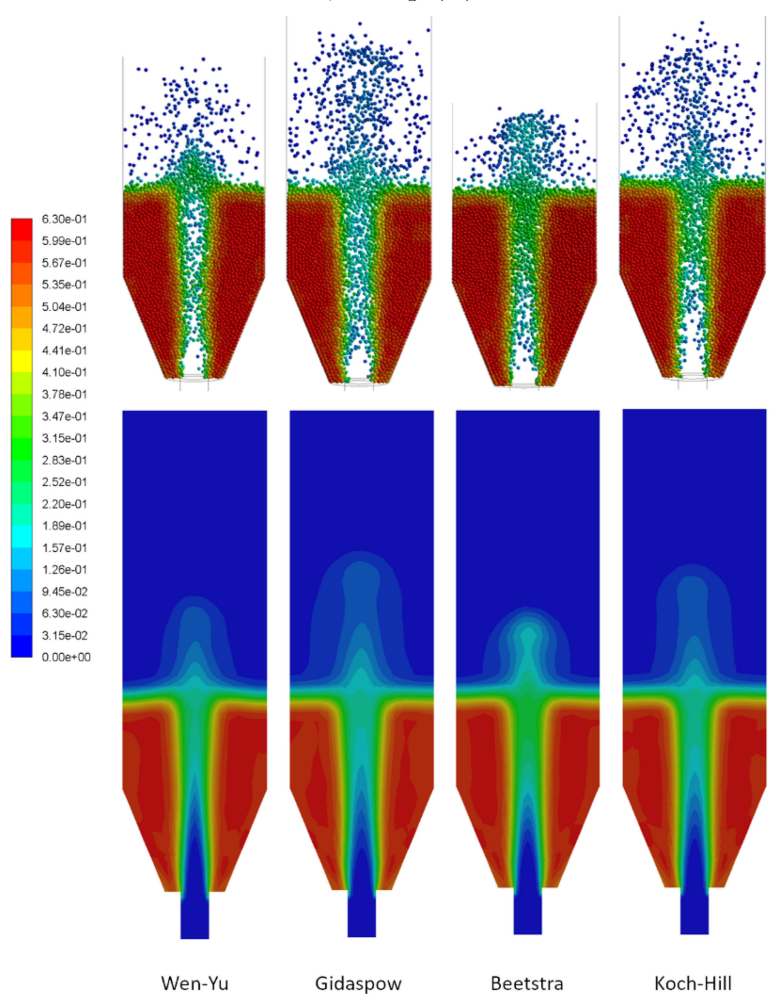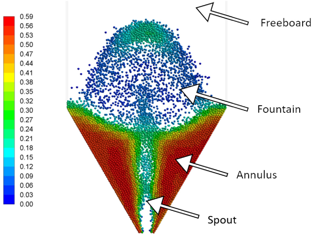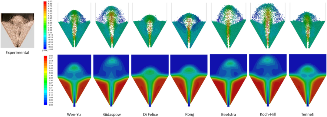 图:在圆柱形喷动床中模拟3s (顶部)和 u/ums = 1.3和 Hb = 20cm 的颗粒体积分数(底部)的时间平均轮廓后,颗粒构型的中心部分(由其体积分数着色)。