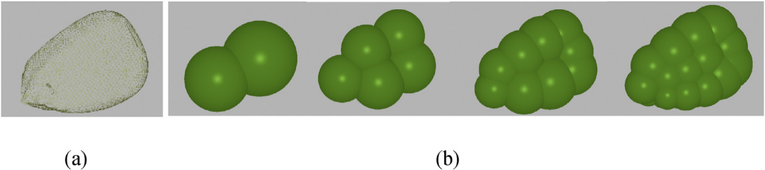 图:(a)由 X 射线显微 CT 扫描仪产生的三维网格模型的一个例子,(b)由 ASG 软件基于三维网格模型产生的胶球团块。从左到右: 两个球体; 五个球体; 10个球体; 20个球体。