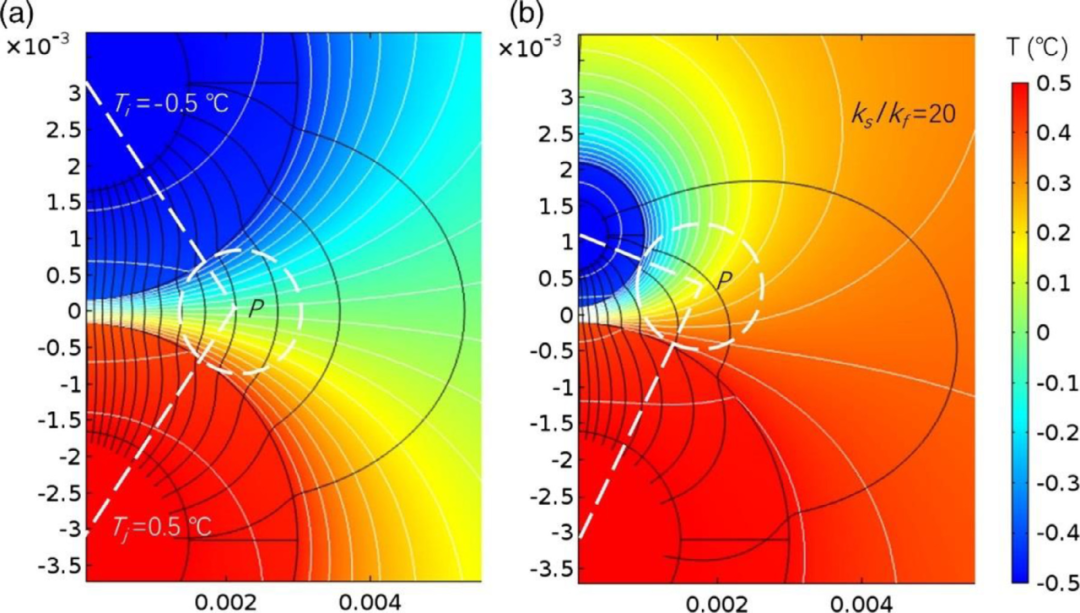 图:基于 Voronoi 多面体模型 B 的两颗粒间间接导热计算方法示意图: (a)接触前和(b)接触后。