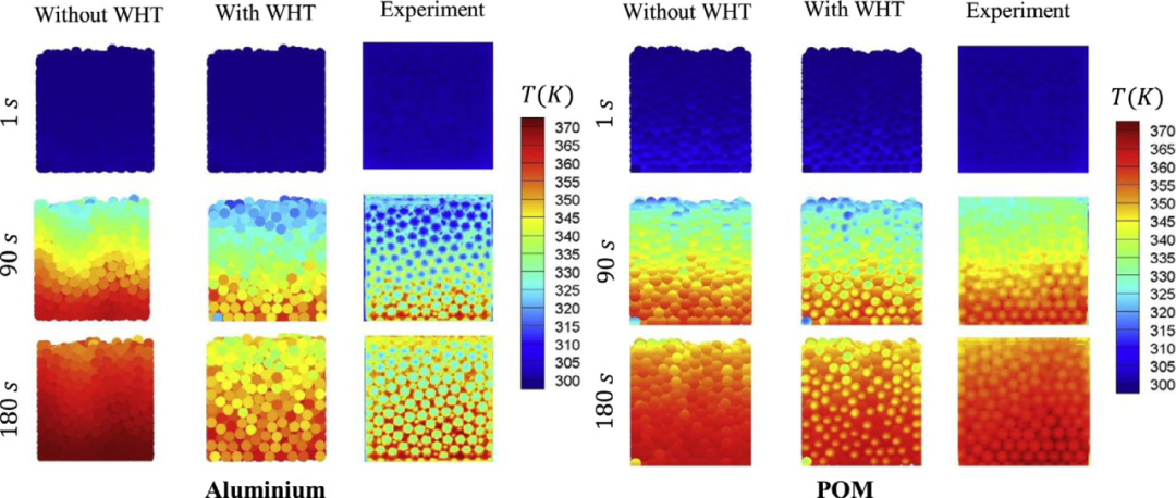 图:对于铝和 POM,基于 DEM 的模拟和实验(由红外照相机测量)在三个不同时刻填充床表面温度的比较。