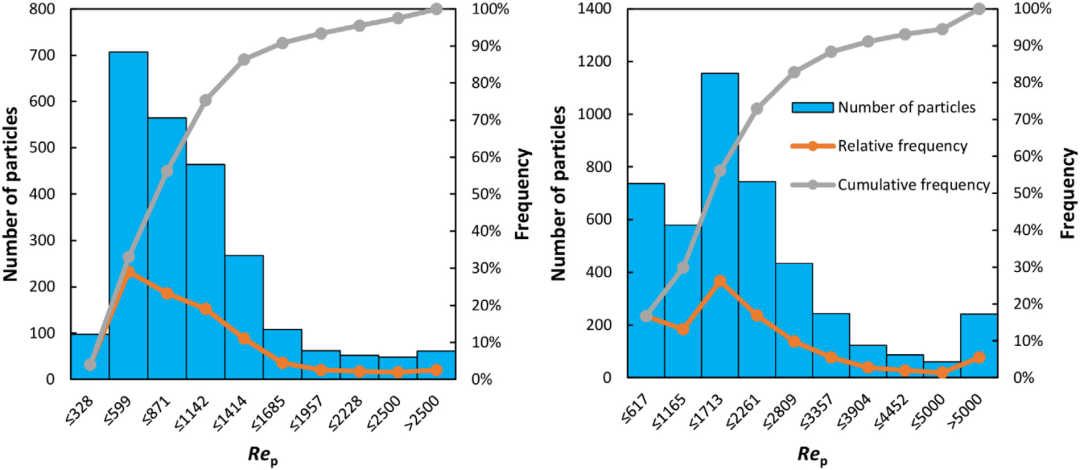 图:准二维(左)和圆柱形(右)喷动床中向上运动颗粒的雷诺数分布。