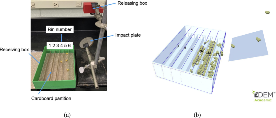 图:玉米粒的颗粒壁COR测试装置。(a) 实验设置和(b)模拟设置。