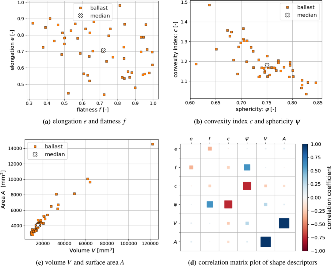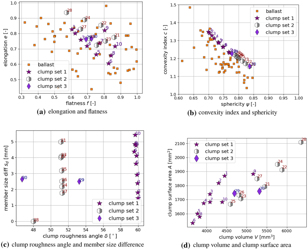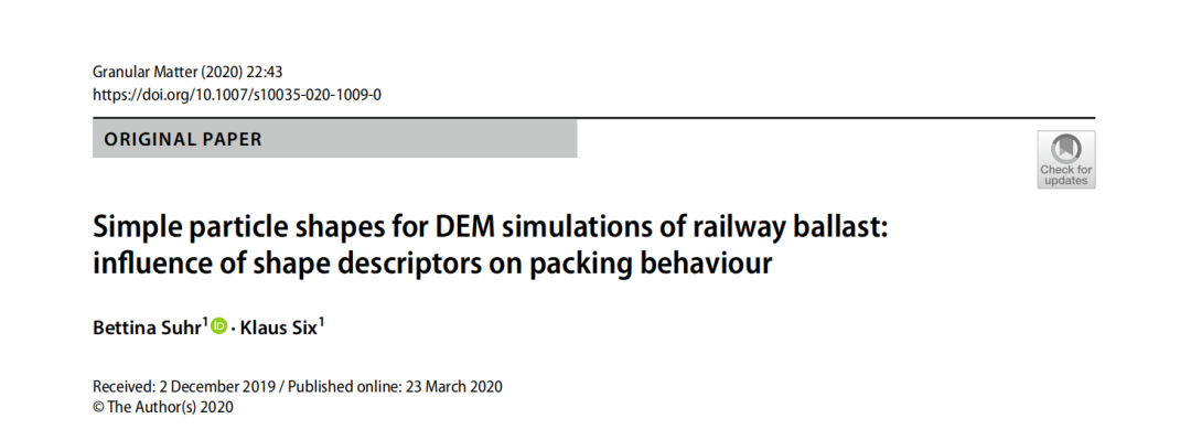 在任何DEM模拟中,所选的颗粒形状都将极大地影响模拟的材料行为。对于特定材料,例如铁路道碴,如何对颗粒形状进行建模仍然是一个悬而未决的问题,这样DEM模拟在计算上是有效的,模拟结果与测量结果非常一致。虽然文献中对铁路道碴的DEM形状建模进行了很好的阐述,但方法主要旨在近似石头的实际形状,导致颗粒形状相当复杂,因此难以确定。相反,将构建非常简单的DEM形状,即三个球体的团块,其目的是近似所考虑的压载材料的形状描述符。在填充行为的DEM模拟中,识别出一组团块形状,这些形状可以在轨道现场观察到的孔隙率以及实验室测试中进行填充。在相关性分析中研究了颗粒形状(描述符)和所获得的堆积(特性)之间的关系。模拟填料的孔隙率与四个形状描述符强相关,这四个形状之间也强相关。因此,推导给定颗粒形状的简单形状模型,匹配其中一个形状描述符,可能是使模拟孔隙率更接近测量孔隙率的好的第一步。进行的相关分析还表明,填料的配位数和各向同性组构与更多的形状描述符相关,这使得估计颗粒形状对这些数量的影响更加困难。