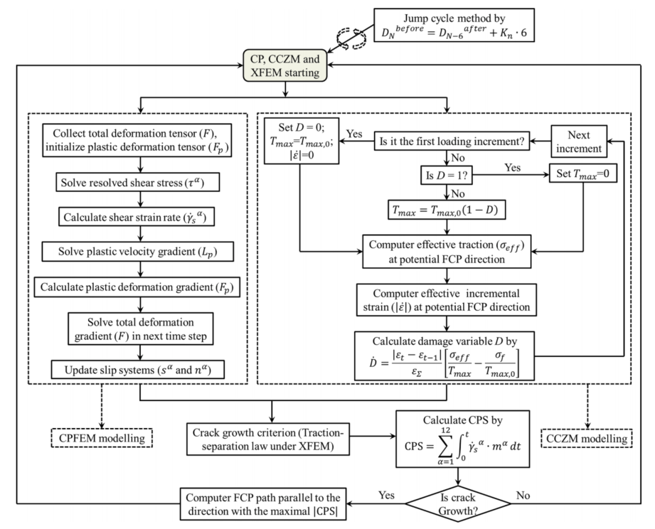 图:耦合模型集成了CP、CCZM、XFEM和循环跳跃技术的流程图。