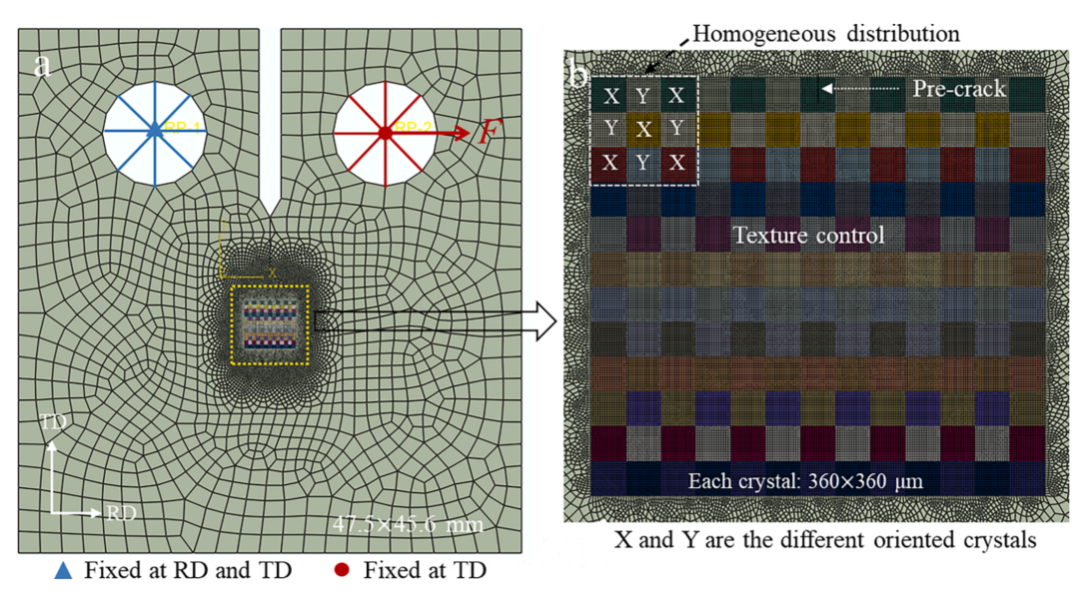 图:多尺度模型(a)CT形状模型和(b)由156个晶粒组成的CP区。