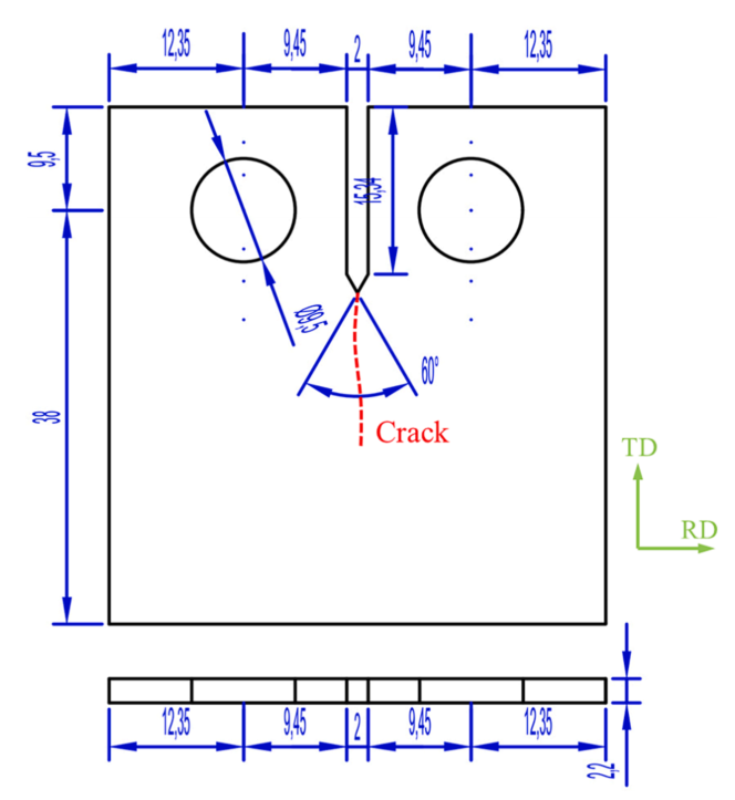 图:FCP的紧凑张力样品的形状(尺寸单位为mm)。