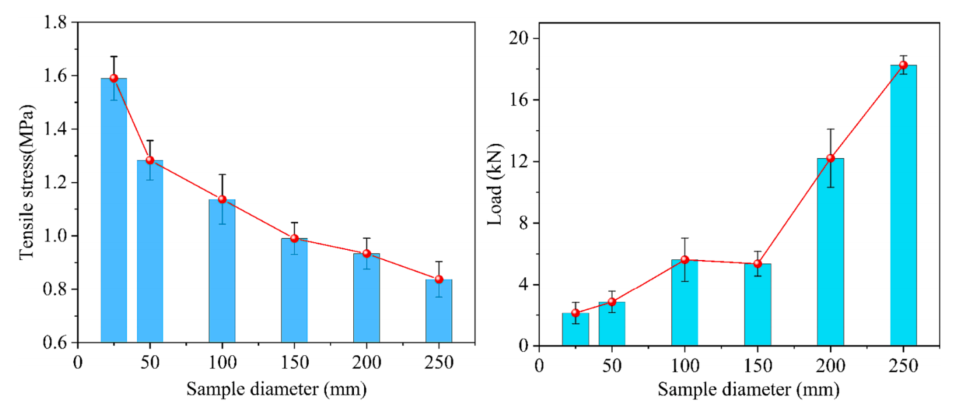 图:峰值拉伸应力和峰值载荷随煤样直径的变化。