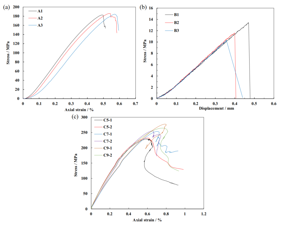 图:应力-应变和应力-位移曲线:a单轴压缩试验,b巴西劈裂试验,c三轴压缩试验