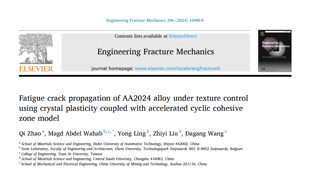 AA2024合金的织构是控制疲劳裂纹扩展(FCP)行为的主要因素,使用晶体塑性(CP)方法可以很好地模拟这种织构特征。此外,由于考虑了损伤演化规律,循环粘性区模型(CCZM)在模拟FCP行为时具有比粘性区模型更高的可靠性。在这项工作中,CP首次与CCZM集成,以预测AA2024合金在织构控制下的FCP行为。为了减少耗时,在XFEM框架下,在这种耦合的CP-CCZM中巧妙地实现了加速策略,试图更快、准确地预测纹理对FCP行为的影响。还进行了FCP和电子背散射衍射(EBSD)实验,为检验该模型的可靠性和准确性提供了参考。研究发现,这种耦合方法在纹理控制下模拟FCP行为时具有很强的能力和鲁棒性。然后利用这种耦合方法模拟了由鞋底强高斯、立方体和黄铜纹理引起的三种典型的FCP特征,并对相应的FCP行为进行了详细的比较分析。