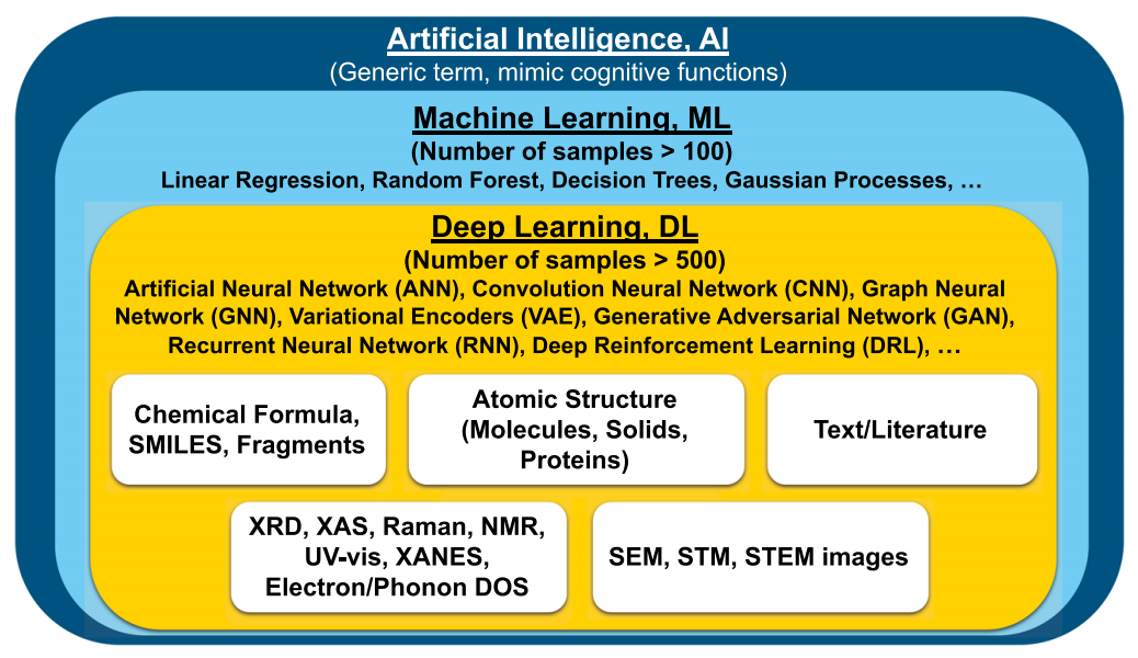 图:示意图显示了人工智能(AI)、机器学习(ML)和深度学习(DL)方法及其在材料科学和工程中的应用概述。深度学习被认为是机器学习的一部分,包含在一个总括术语人工智能中。