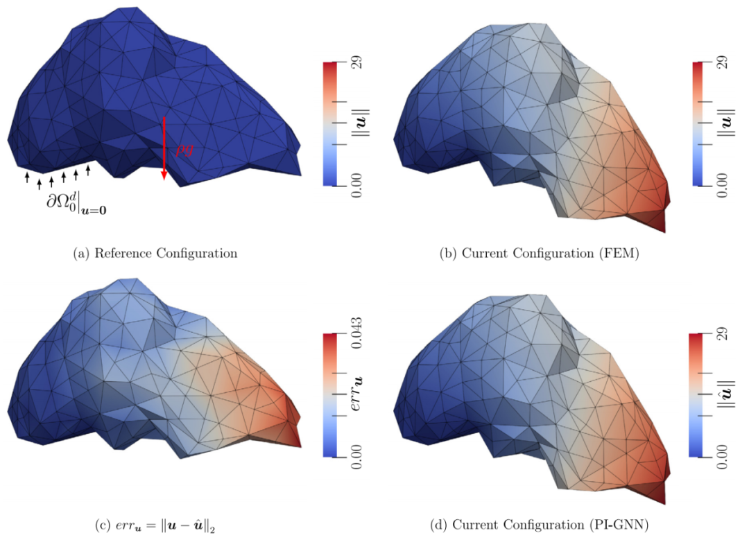 现代计算软组织力学模型有可能提供独特的、针对患者的诊断见解。然而,由于使用传统数值求解器进行力学模拟时产生的计算成本过高,这种模型在临床环境中的部署受到了限制。在临床相关的时间范围内获得结果的另一种方法是使用计算高效的代理模型,称为模拟器,代替数字模拟器。在这项工作中,我们提出了一个软组织力学的仿真框架,该框架以两种方式建立在传统方法的基础上。首先,我们使用图神经网络(GNN)进行仿真。GNN可以自然地处理给定患者的独特软组织几何形状,而不需要进行任何低阶近似。其次,模拟器是以物理知情的方式进行训练的,以最大限度地减少势能函数,这意味着训练不需要昂贵的数值模拟。我们提供的结果表明,我们的框架允许对一系列软组织力学模型进行高度准确的仿真,同时比模拟器更快地进行几个数量级的预测。