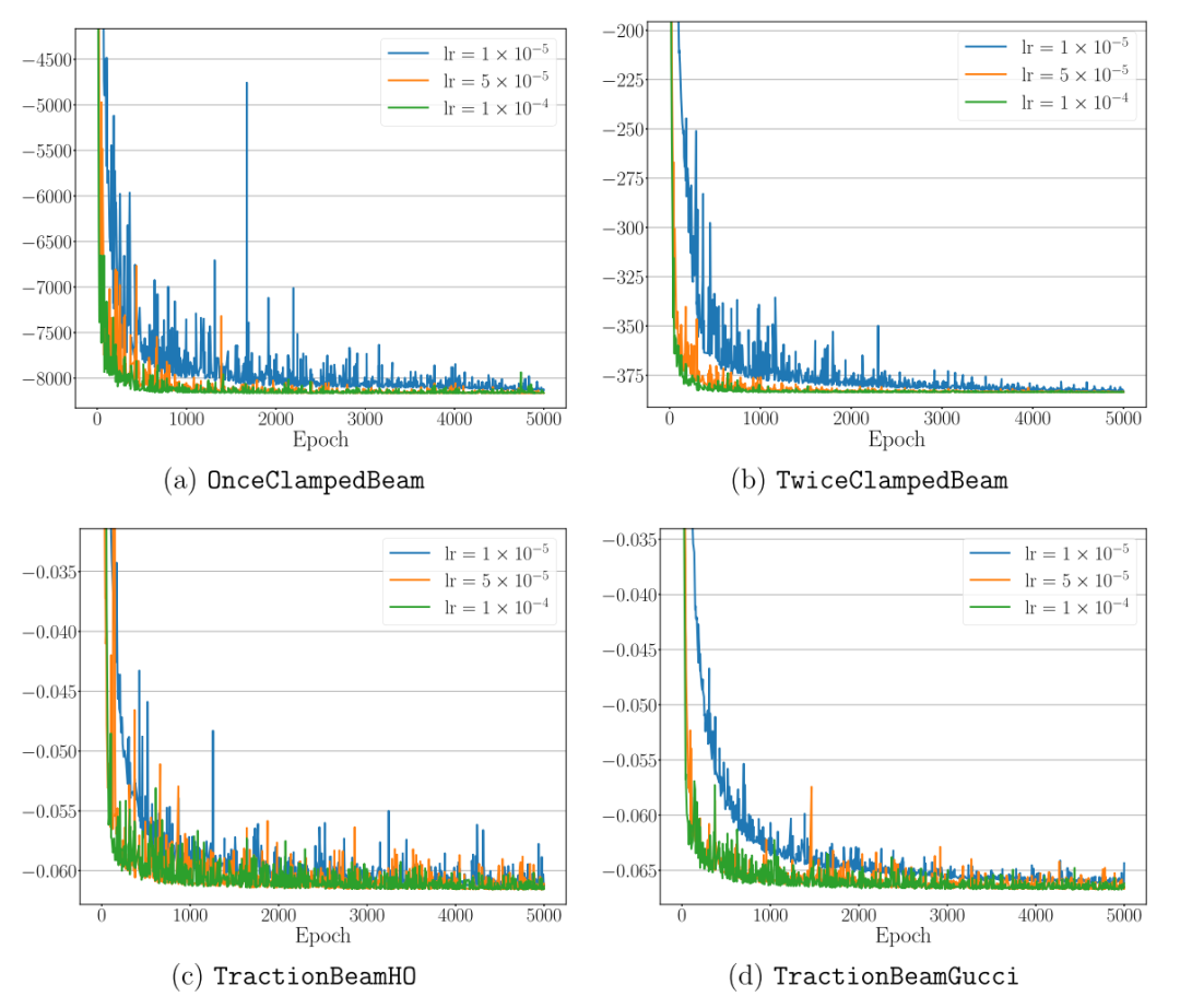 图:均值迹线图(𝛱) 对于使用不同学习率的四个波束模型。
