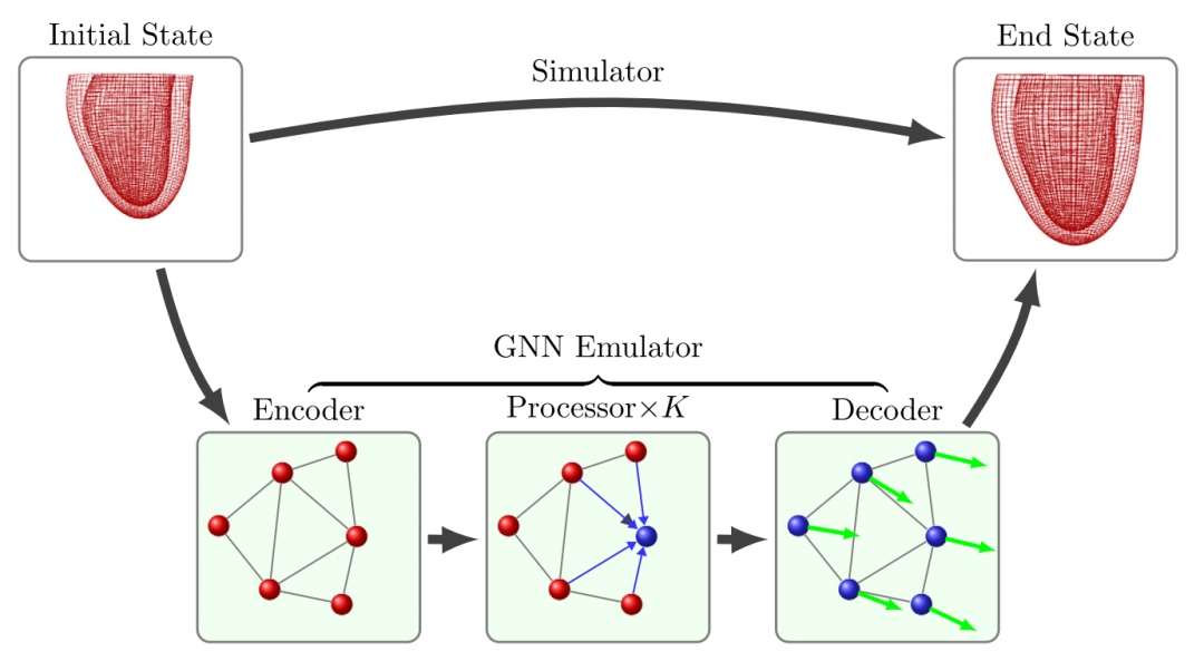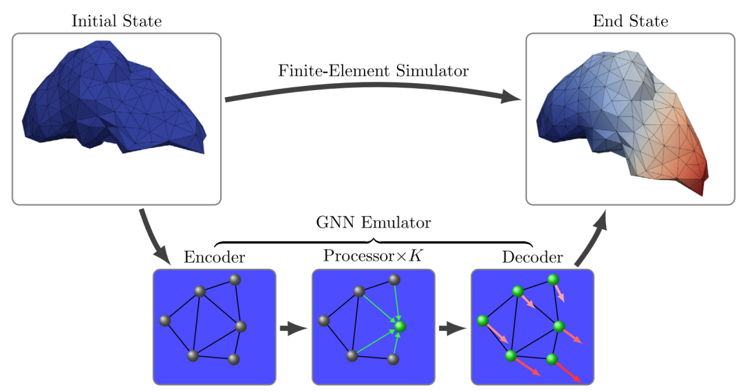 图:GNN仿真示意图。模拟器利用三阶段编码-处理-解码框架将物理系统的初始状态映射到其最终状态。