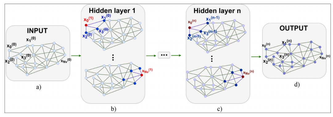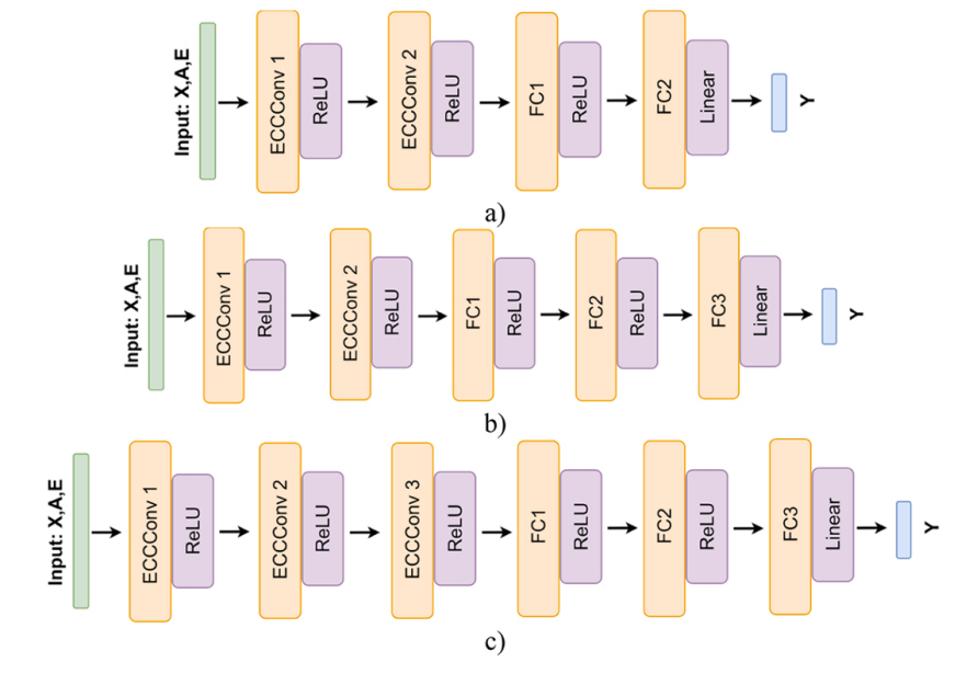 图:研究的GNN架构:a)拓扑结构1,b)拓扑结构2,c)拓扑结构3。