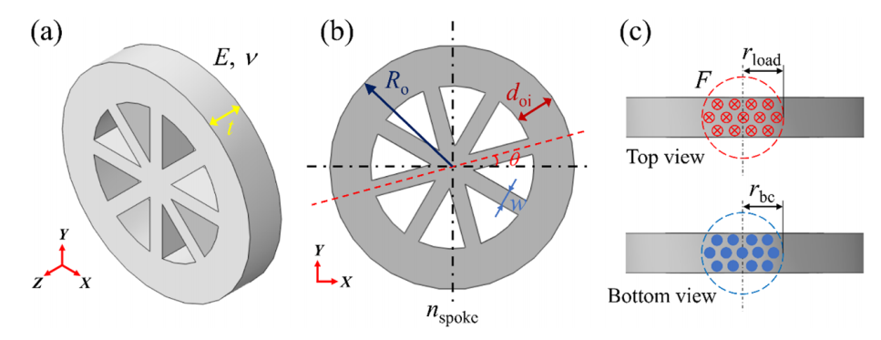 图:有限元模型和数据生成工作流程。(a) 车轮模型的总体几何结构。(b) 车轮模型的前视图。(c) 荷载和边界条件的说明。