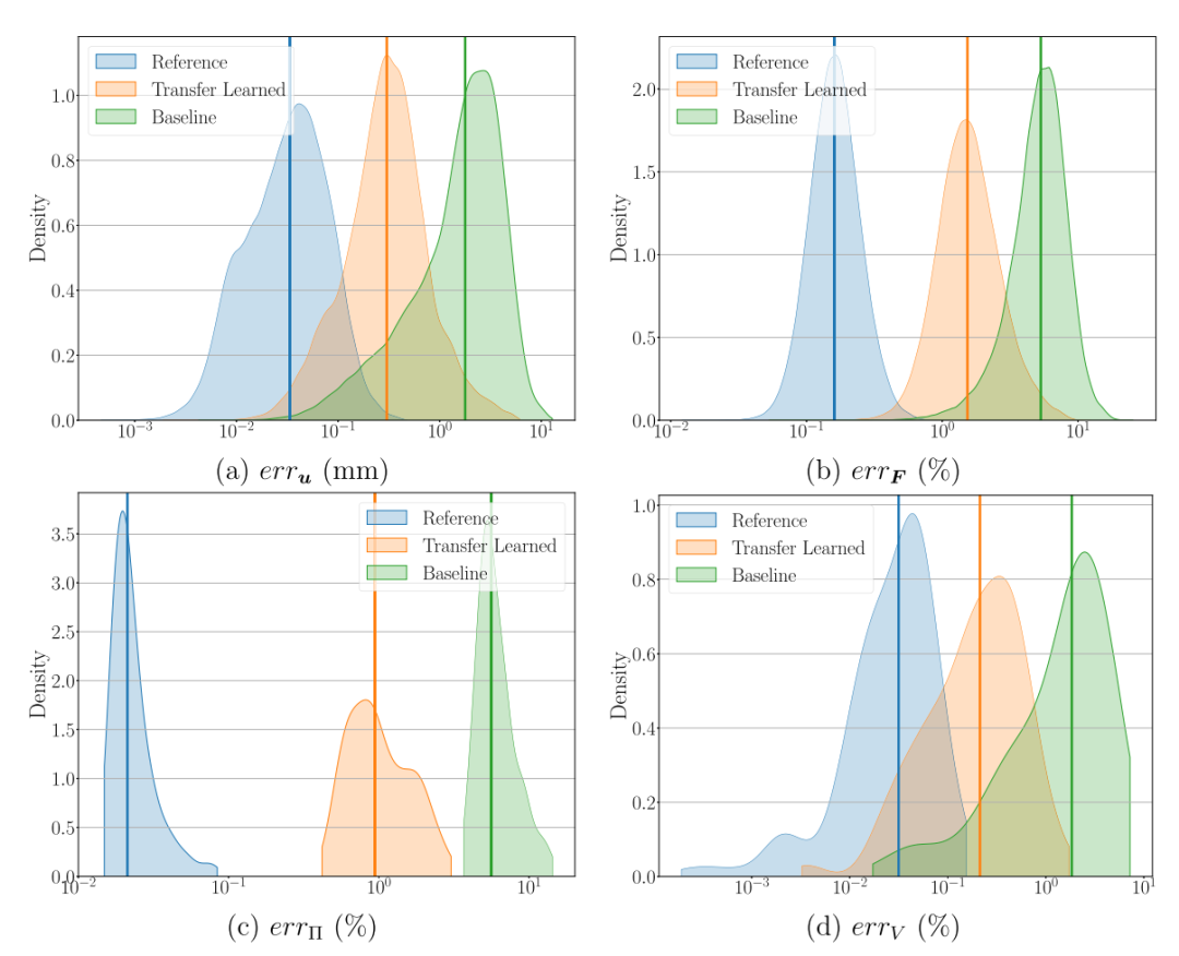 图:从零开始训练15000个时期的GNN的新LV几何形状的仿真结果的比较(参考),与训练12个时期的转移学习GNN(转移学习)和训练12个时代的随机初始化GNN(基线)。