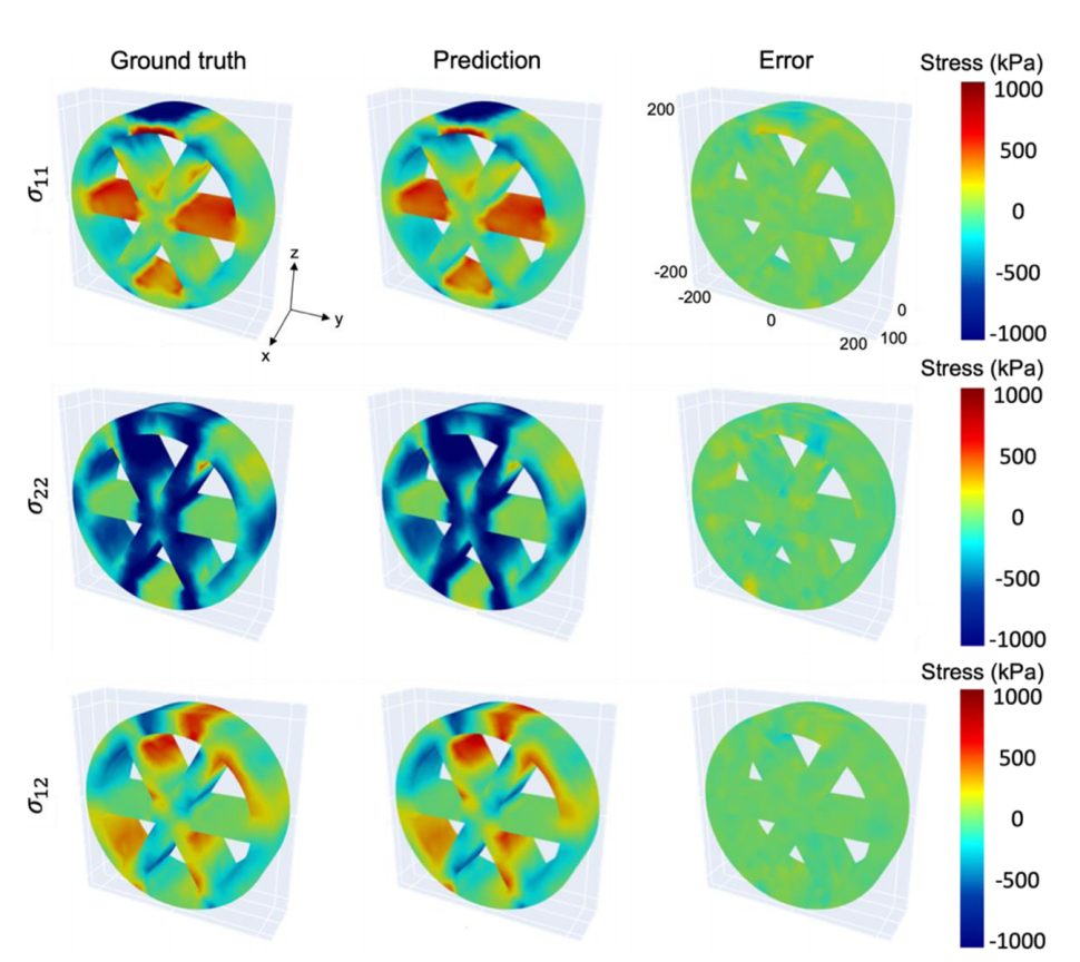 图:“原始数据集”测试数据中车轮设计应力预测的可视化。σ11、σ22和σ12分别显示在第一行、第二行和第三行。第一列显示了通过模拟获得的地面真实应力剖面,第二列表示GNN模型的输出预测。第三列是预测与实际情况之间的应力差异。该预测是根据我们的香草GNN模型生成的。轴上数字标签的单位为毫米。