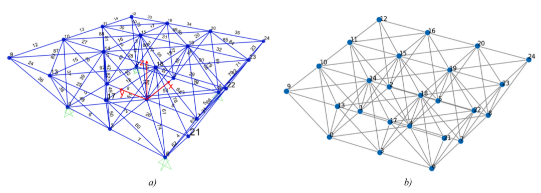 图:空间特拉斯案例研究:a)RM的可视化,b)考虑可视化节点坐标的图形表示。