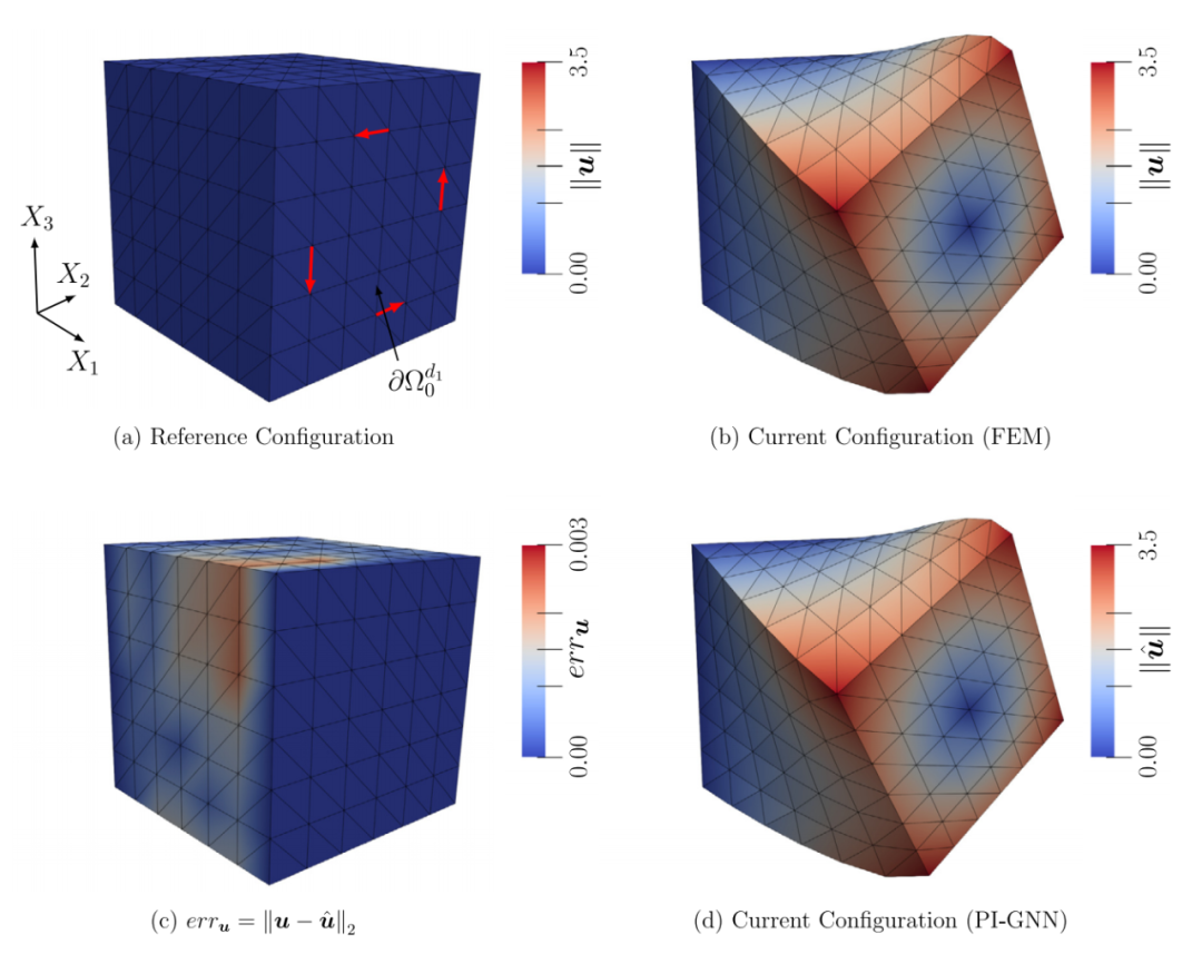 图:我们用于三维固体力学问题的GNN体系结构的说明。首先基于节点和边缘几何信息(G)、材料特性(M)和边界条件(BC)对网格结构进行编码。之后,通过消息传递(GNN模型的核心)更新编码信息,然后是解码模块,该解码模块将潜在信息传输到物理轮廓,例如应力(S)和位移(U)。